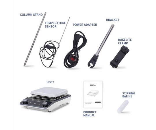 Power adapter, 1×stir bar, temperature sensor rod and mount bracket
